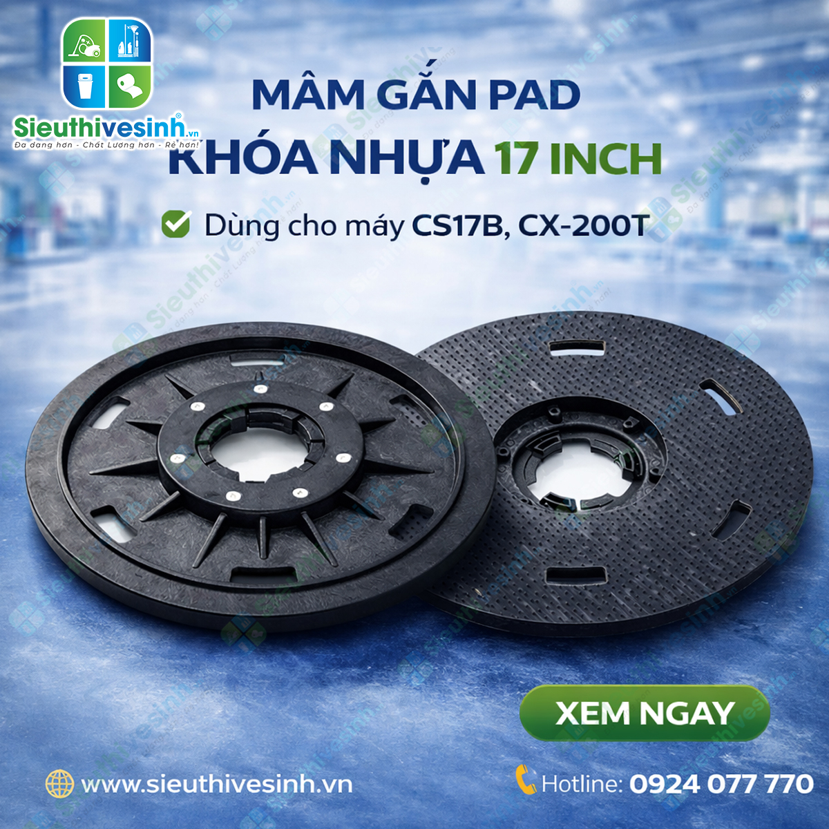 Trong quá trình vệ sinh sàn chuyên nghiệp, mâm gắn pad là phụ kiện quan trọng giúp cố định pad chà sàn chắc chắn, hỗ trợ máy vận hành ổn định và nâng cao hiệu quả làm sạch. Mâm gắn pad khóa nhựa 17 inch dùng cho máy CS17B, CX-200T là lựa chọn tối ưu dành cho các dòng máy chà sàn phổ biến hiện nay.