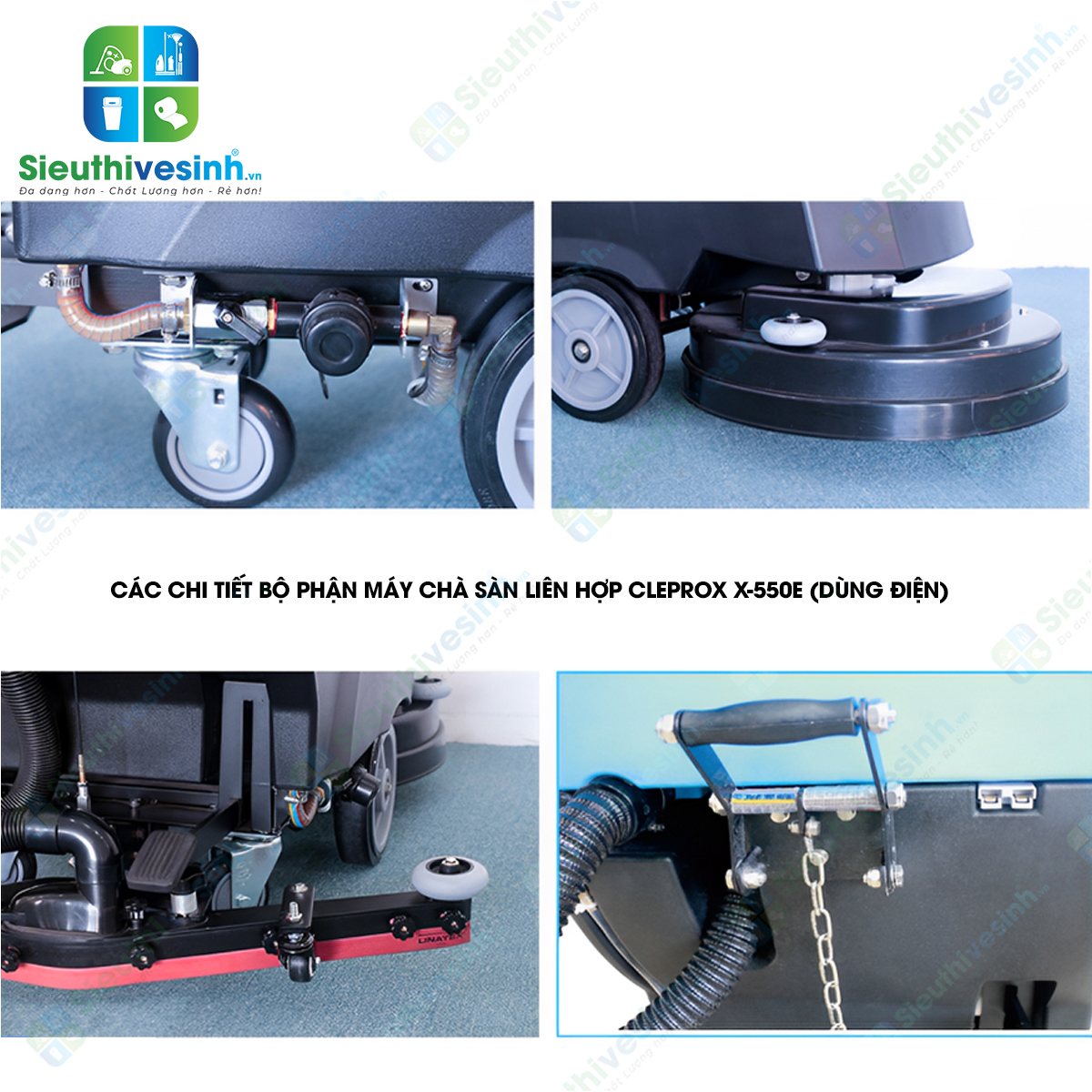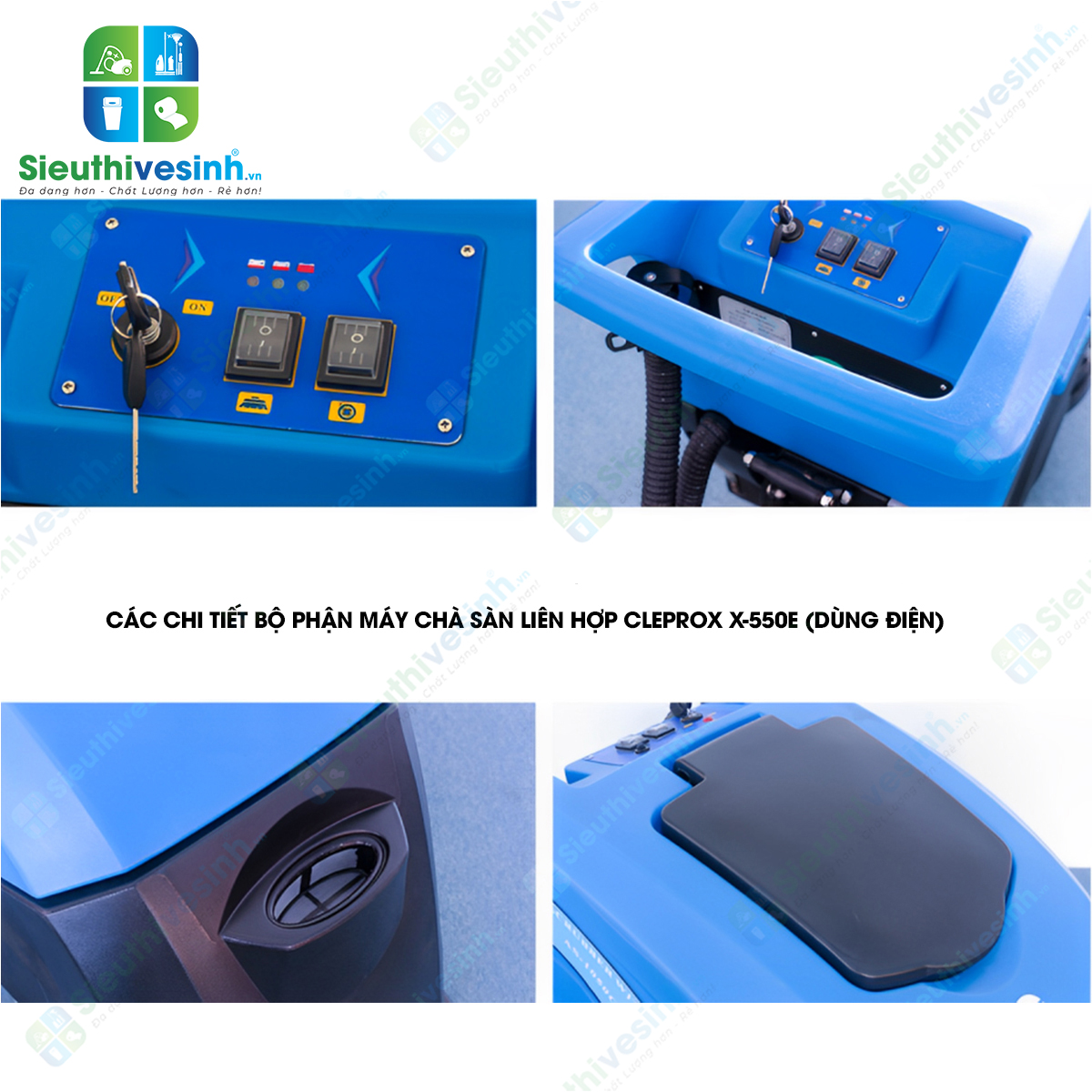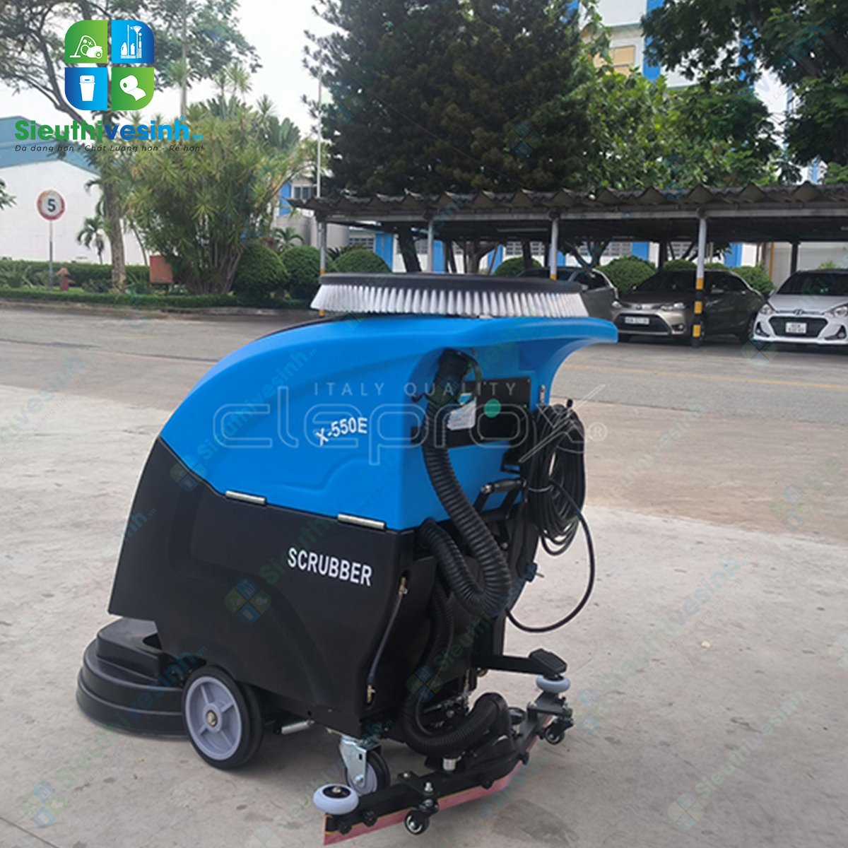 Máy chà sàn CleproX X-550E thuộc dòng liên hợp đẩy tay, tích hợp đầy đủ các chức năng làm sạch hiện đại. Khác với phiên bản dùng ắc quy, model X-550E sử dụng nguồn điện trực tiếp 220V, giúp máy hoạt động ổn định, liên tục trong thời gian dài mà không lo gián đoạn.