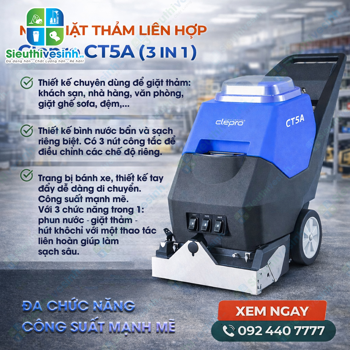 Máy giặt thảm liên hợp Clepro CT5A (3 in 1) là giải pháp vệ sinh chuyên sâu dành cho thảm, ghế sofa và các bề mặt vải trong môi trường công nghiệp. Sản phẩm được ứng dụng công nghệ hiện đại, cho phép thực hiện 3 công đoạn trong 1: phun hóa chất – chà sạch – hút khô, giúp loại bỏ bụi bẩn tận sâu bên trong sợi vải.
