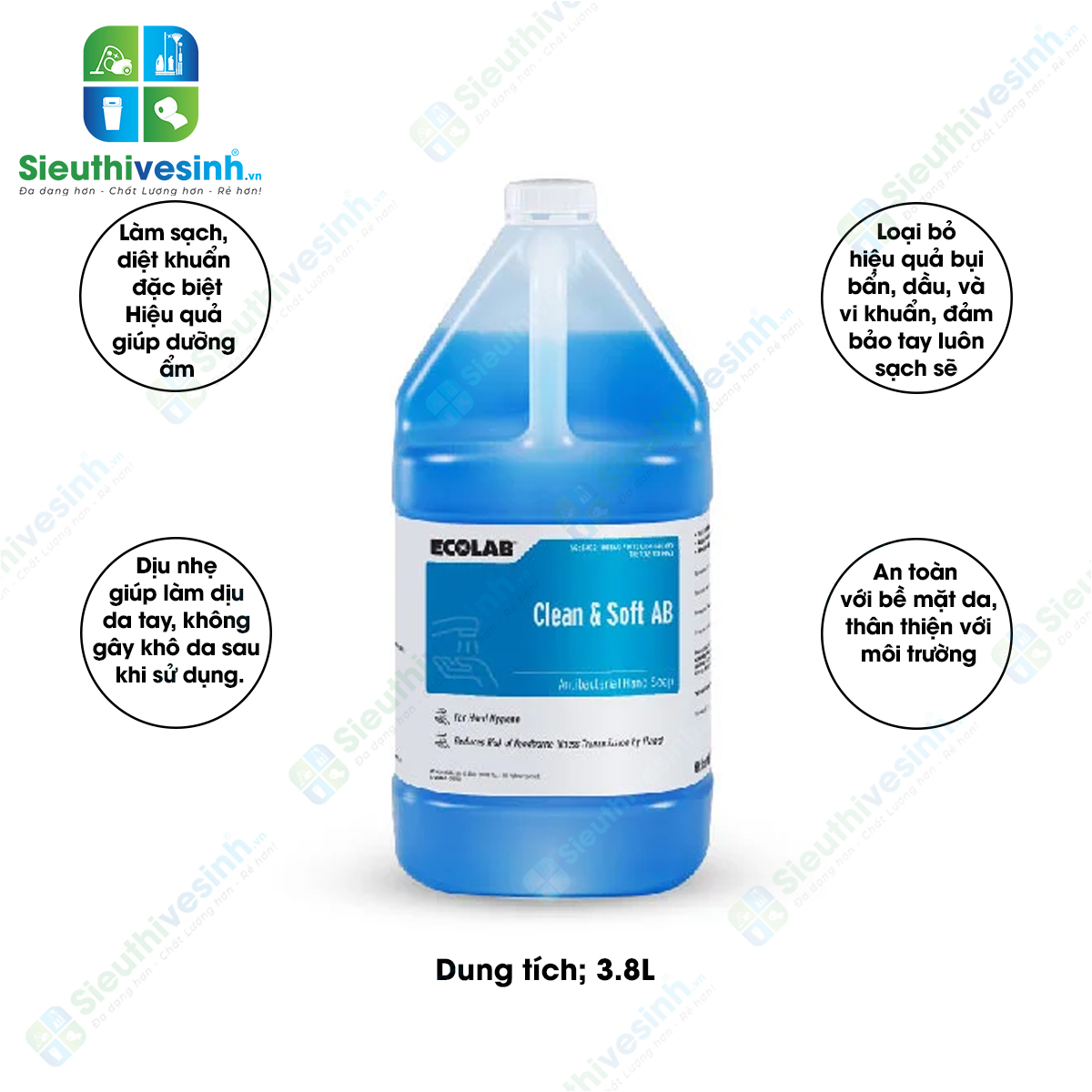 Xà Bông Rửa Tay Khử Khuẩn Ecolab Clean & Soft AB 3.8L là dung dịch rửa tay khử khuẩn cao cấp đến từ thương hiệu Ecolab (Mỹ). Sản phẩm hiện được phân phối chính hãng tại sieuthivesinh.vn, chuyên cung cấp giải pháp vệ sinh công nghiệp – y tế – nhà hàng khách sạn.